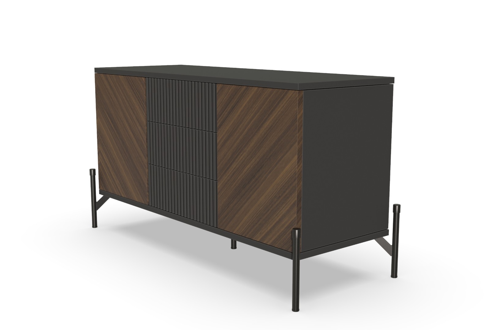 Отделка этой тумбы под ТВ в диагональном направлении текстуры создает ощущение глубины и динамики. Эта техника декорирования мебели делает ее уникальной и позволяет гармонично вписаться в разные стили интерьера.